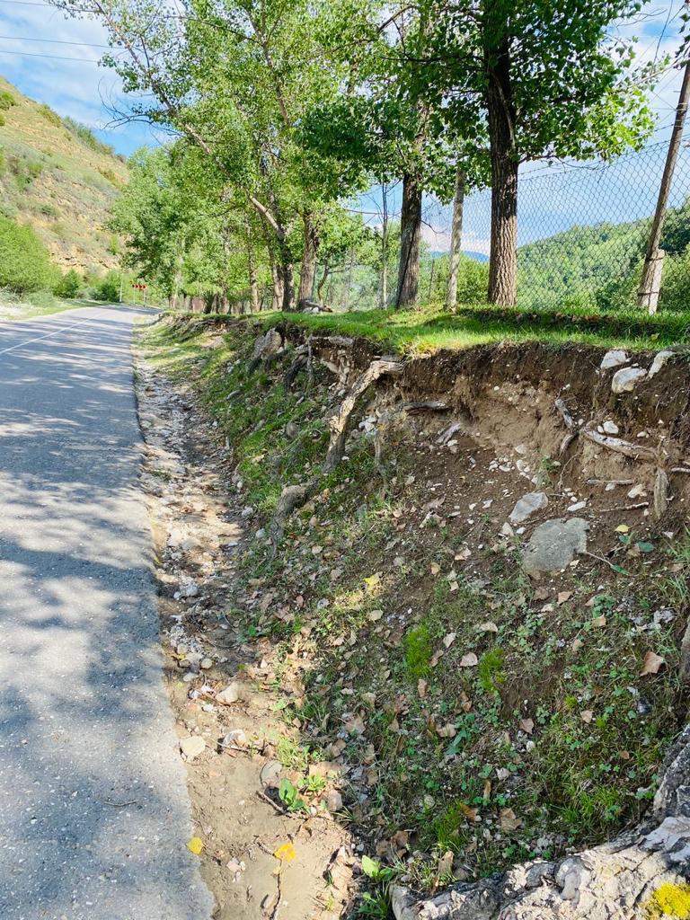 Однако в связи с тем, что дорога расположена несколько ниже аллеи, вследствие эрозии почвы и многолетних вымываний ливнями вдоль аллеи образовался стихийный обрыв высотой от полутора до трех метров. В последние годы граница обрыва сместилась в сторону аллеи так, что сегодня корни деревьев оголились. И есть большая вероятность того, что эта аллея до следующего года не сохранится, деревья попросту упадут на дорогу.
