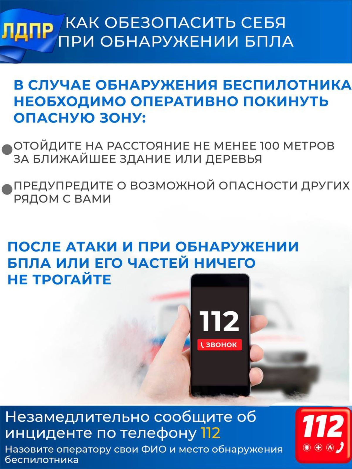ЛДПР выпустила инструкции для всех россиян, поясняющие, как вести себя в случае обнаружения беспилотного летательного аппарата. Рассказано, что надо делать в случае появления дрона в здании, на улице. Даны пояснения, что нужно делать, и чего делать нельзя