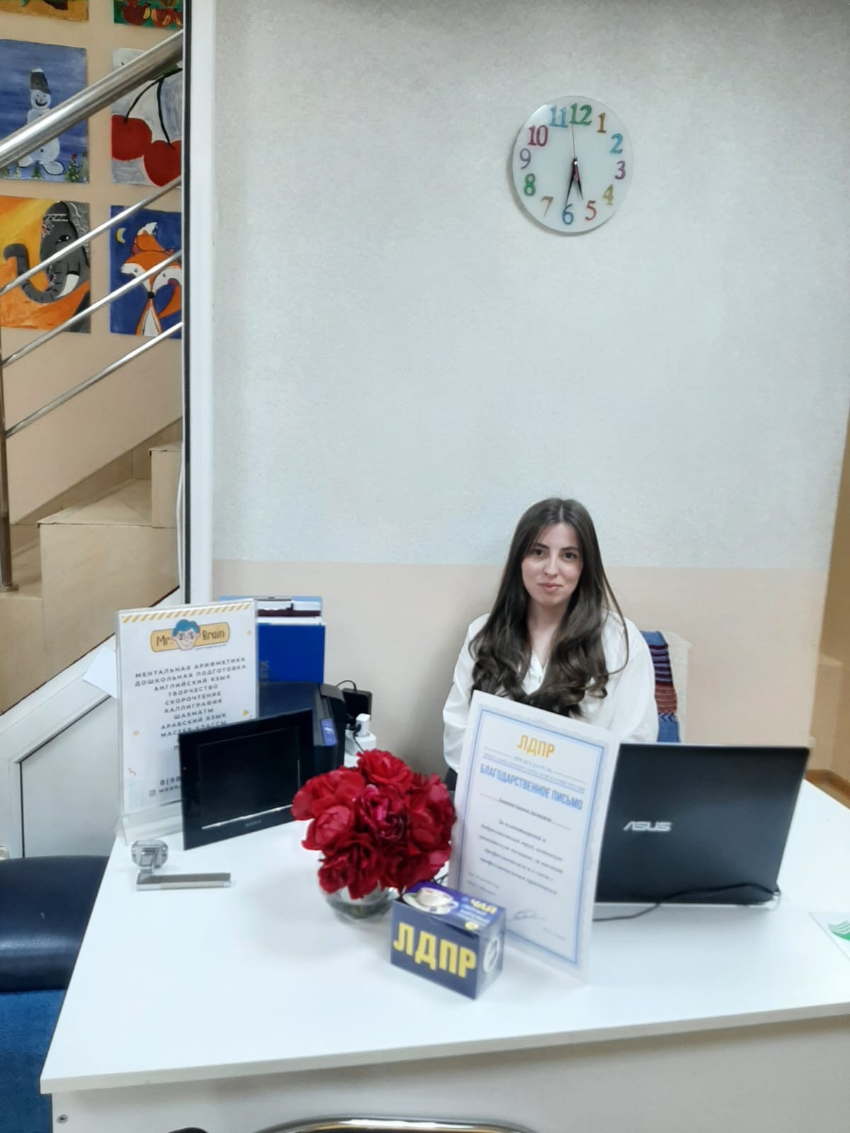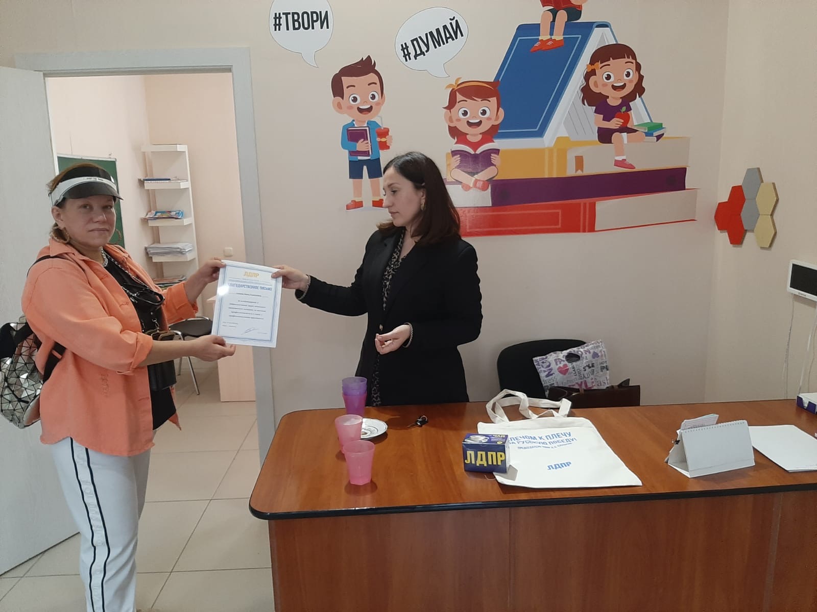 Координатор Кировского МО г. Махачкалы Лариса Давыдова вручила благодарственные письма от имени председателя партии руководителям частных образовательных центров «Интеллект» и «Mr Brain» Фаине Бабаевой и Карине Кадиевой.