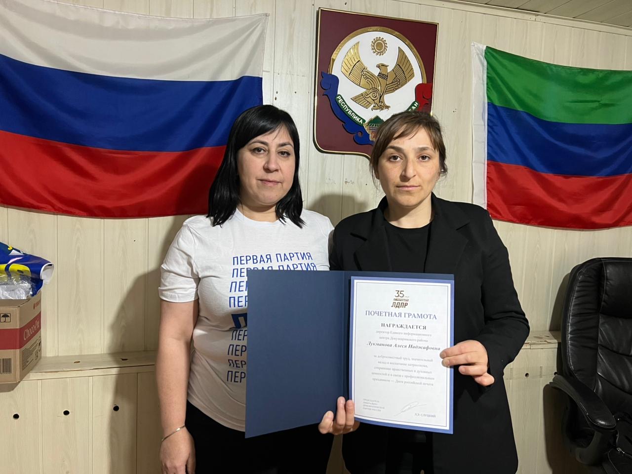 В честь Дня российской печати была отмечена Директор Единого информационного центра Докузпаринского района, член партии ЛДПР Алеся Лукманова.
