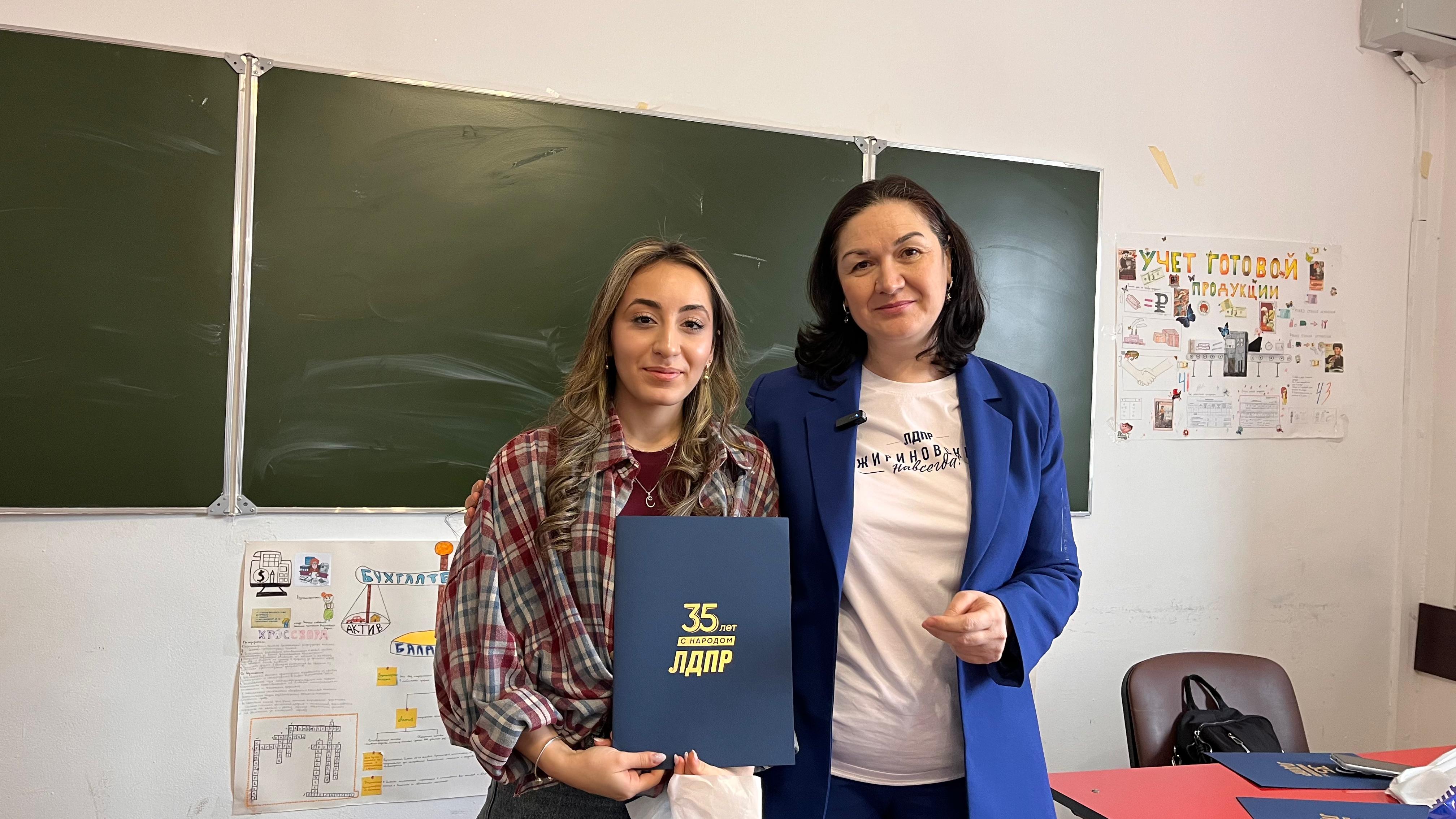 Заключением встречи стало награждение студентов колледжа. Почетными грамотами ЛДПР были отмечены отличники учебы: Сафина Аркалаева, Уммукусум Ибнугаджарова, Рукият Каратова, Париза Магомедрасулова, Биги Наврузова, Марьям Сулебанова, Муминат Юнусова.