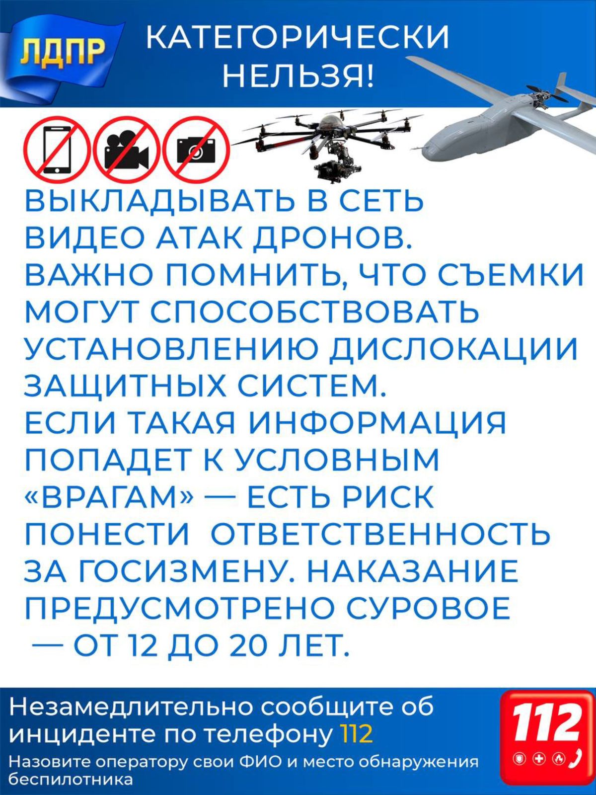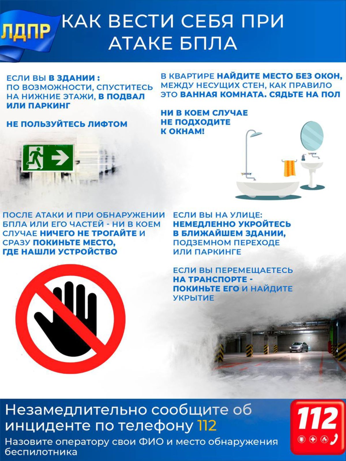 ЛДПР выпустила инструкции для всех россиян, поясняющие, как вести себя в случае обнаружения беспилотного летательного аппарата. Рассказано, что надо делать в случае появления дрона в здании, на улице. Даны пояснения, что нужно делать, и чего делать нельзя